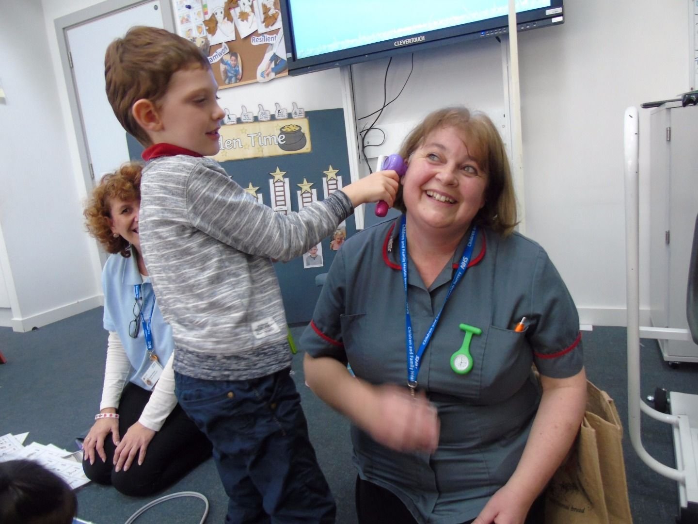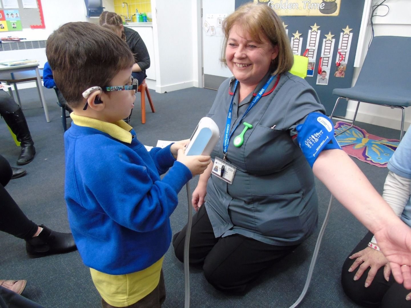 Both Woodlands and Portesbery school children used professional equipment to carryout blood pressure readings, height measurements, temperature and eye examinations on the nurse team and their classmates.